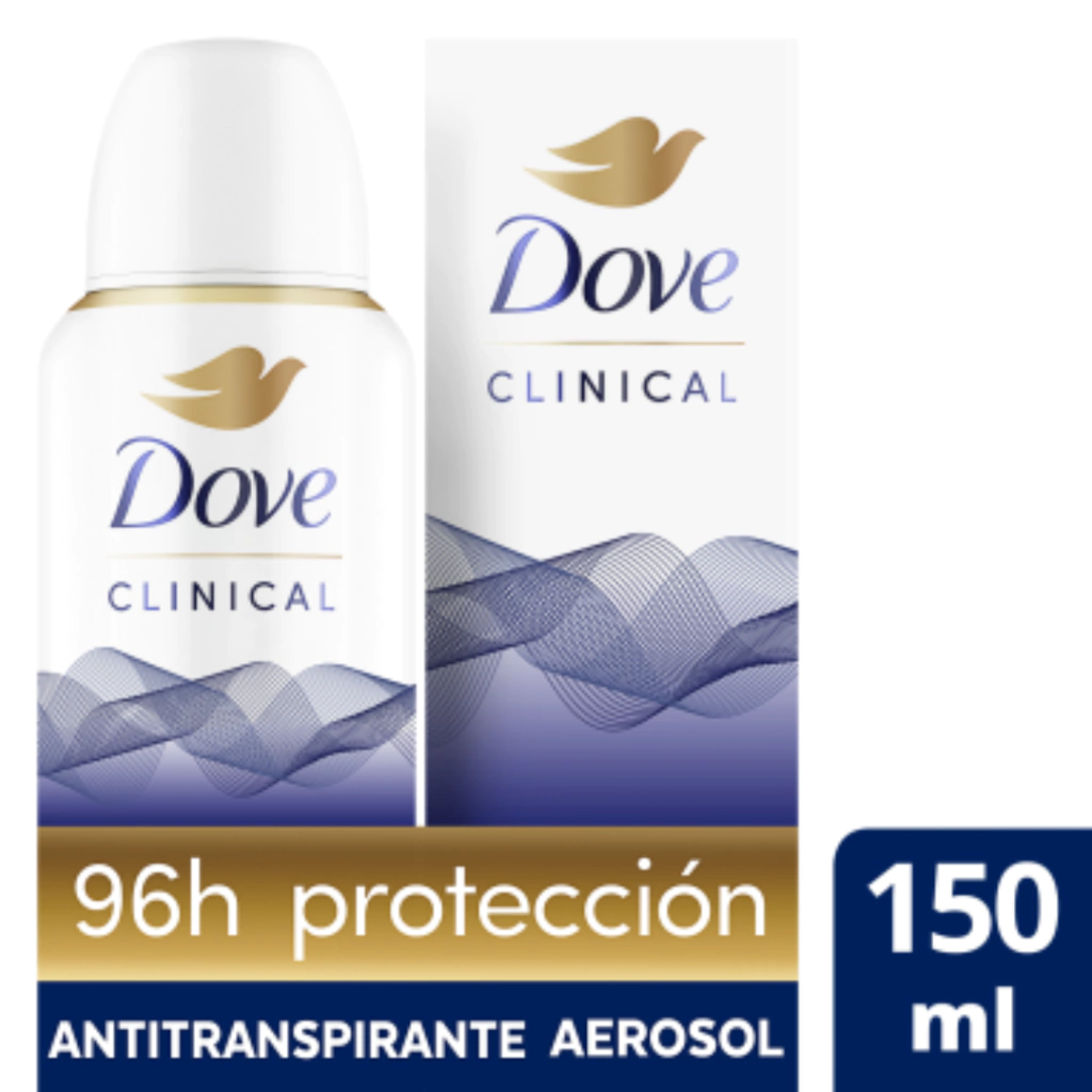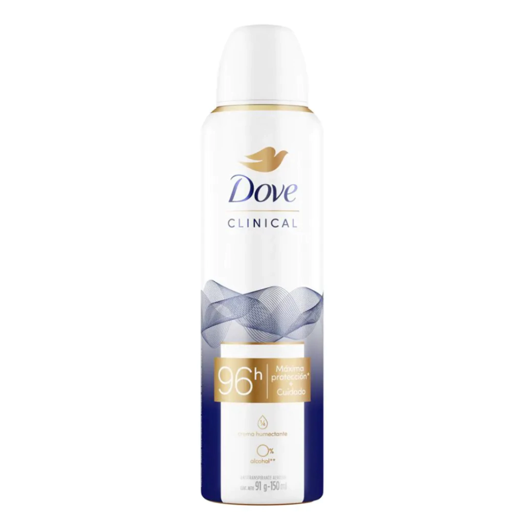 El nuevo Antitranspirante en aerosol Dove Clinical te ofrece una máxima protección con todo el cuidado de Dove. La exclusiva combinación de ingredientes del antitranspirante en aerosol Dove Clinical forma una barrera contra el sudor mucho más potente que un antitranspirante común, y por eso es más efectiva. Su exclusiva tecnología forma un micro escudo de protección que dura hasta por 96 horas. Además, su fórmula 0% alcohol y con un 1/4 de crema humectante que humecta la piel de tus axilas y ayudan a combatir el daño y la irritación. Dove Clinical te da 3 veces más protección vs. un antitranspirante básico. Además, toda la línea de Dove es hipoalergénica*, está probada dermatológicamente. La próxima vez que estés apurada o frente a una situación estresante, podés estar tranquila de que estarás seca y fresca con el desodorante antitranspirante Dove Clinical. ¡MÁXIMA PROTECCIÓN + CUIDADO! Está especialmente diseñado para aquellas personas que buscan la máxima eficacia, con todo el cuidado de Dove. Para un rendimiento óptimo sugerimos aplicar el producto de noche, ya que le permite formar un mayor nivel de protección cuando tu cuerpo descansa. Aplicar una vez al día, no necesita reaplicar. Dove Clinical cuenta con certificación vegana y no testea en animales. BENEFICIOS: Nuevo Antitranspirante en aerosol DOVE Clinical. Este antitranspirante está desarrollado específicamente para prevenir la transpiración excesiva y brindarte todo el cuidado para tus axilas. ¡MÁXIMA PROTECCIÓN + CUIDADO! La tecnología del antitranspirante Dove Clinical forma un microescudo que dura 96 horas. Este desodorante antitranspirante contiene ¼ de crema humectante y tiene 0% alcohol. El antitranspirante Dove Clinical te ofrece una protección efectiva contra la transpiración y el mal olor. Los antitranspirantes Dove no testean en animales en ningún lugar del mundo y cuentan con certificación vegana.